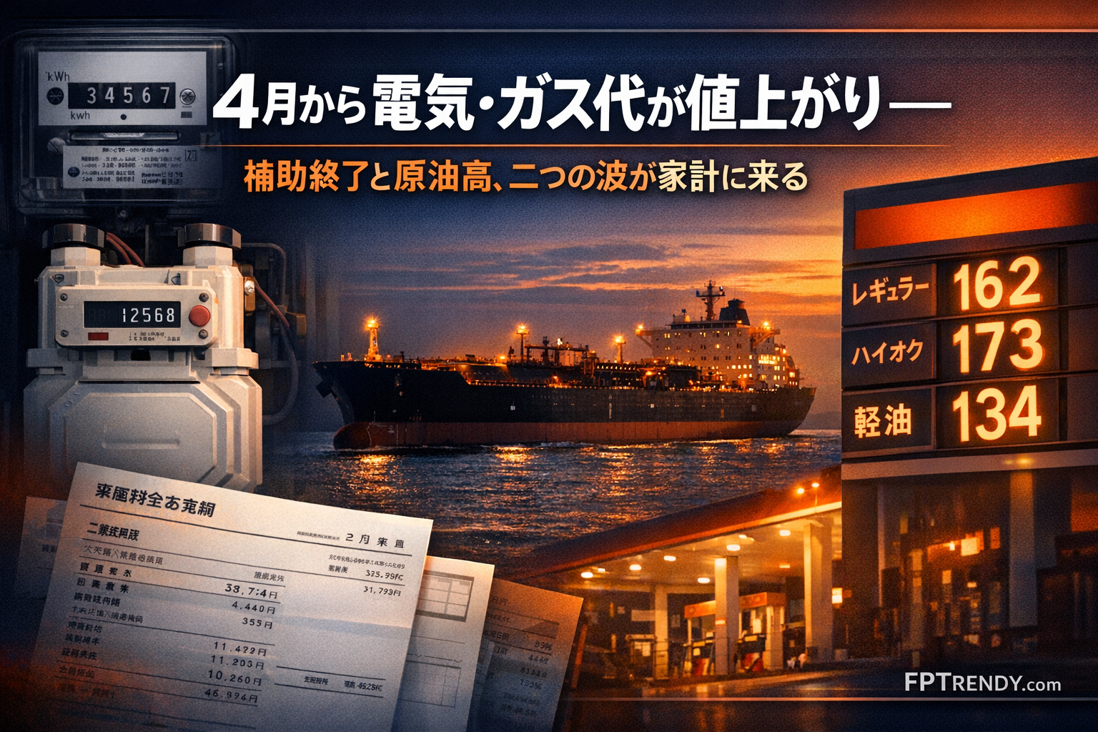 ガソリンは先週より安くなったのに、4月使用分以降の電気代・ガス代の請求は上がる──そんな逆方向の動きが同時に起きる。イラン情勢の緊迫化で原油価格が高騰するなか、エネルギー別に価格が家計へ届くタイミングが異なるためだ。まず「なぜ今、電気・ガスが上がるのか」、そして「原油高はいつ請求に来るのか」を順番に整理する。
