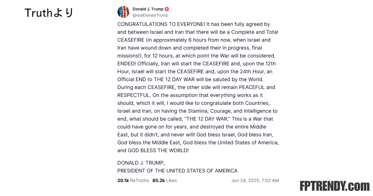 2025年6月24日午前7時すぎ(日本時間)、トランプ米大統領は自身のSNS「トゥルース・ソーシャル」で「イスラエルとイランが完全かつ全面的に停戦することで合意した」と投稿しました。トランプ氏によれば、まずイランが戦闘を停止し、その後イスラエルが停止。停戦は12時間継続し、その時点で「戦争は正式に終了したとみなされる」としています。これまでにイスラエル、イラン双方からの公式発表はなく、現地では依然として緊張が続いています。