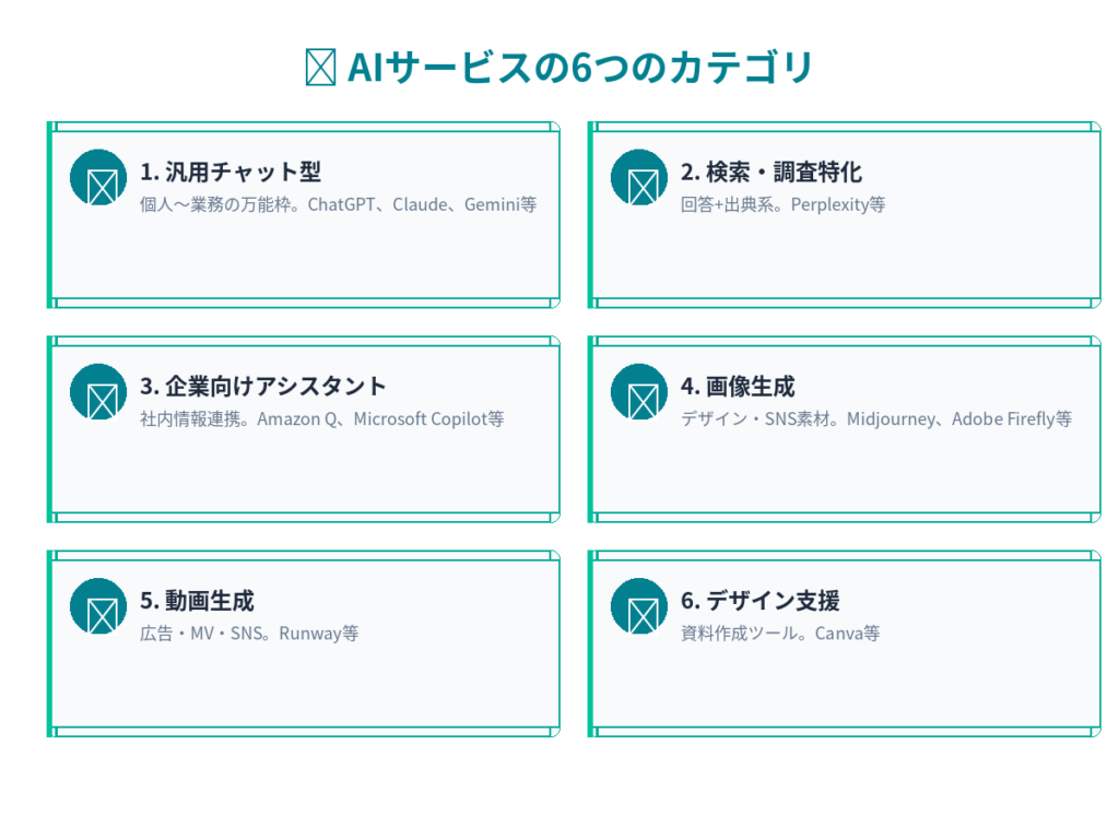 現在提供されているAIサービスは、大きく以下の6つのカテゴリに分類できます。