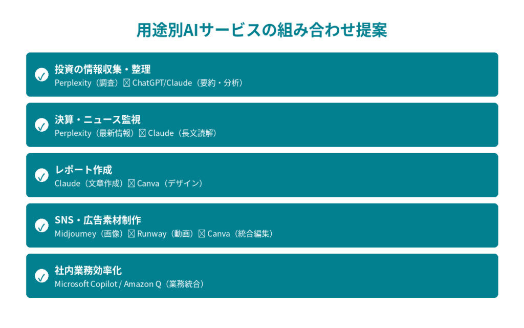 投資情報の収集やレポート作成、SNS素材制作など、具体的な用途に合わせた組み合わせ提案も紹介していますので、ぜひ最後までご覧ください。