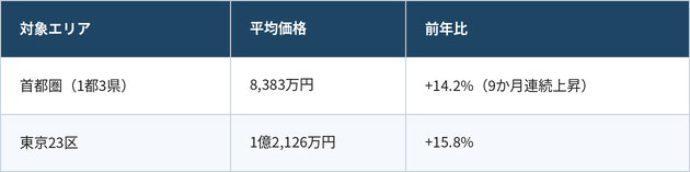 今回の公表値は、首都圏(1都3県=東京・神奈川・埼玉・千葉)の平均が8,383万円(前年比+14.2%・9か月連続上昇)、東京23区は1億2,126万円(前年比+15.8%)だった。