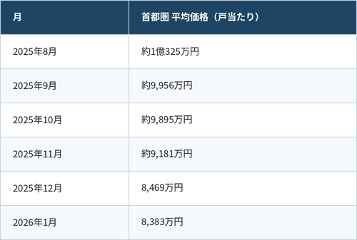 首都圏の平均価格(戸当たり)は、2025年8月に約1億325万円をつけた後、緩やかに落ち着く動きが続いている。