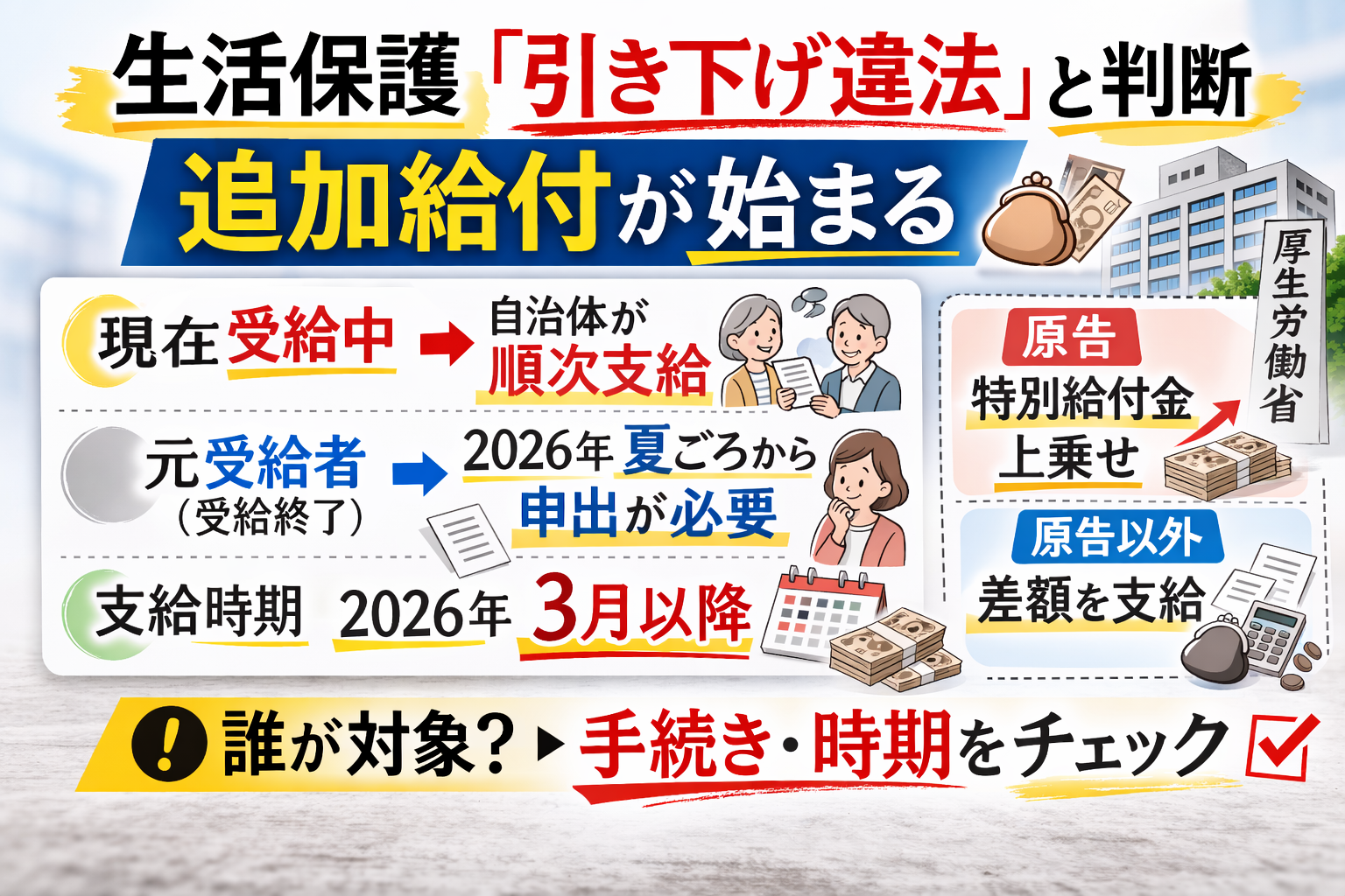 この判決を受け、厚生労働省は追加給付の枠組みを告示し、2026年3月以降、準備が整った自治体から順次、対象者への支給を始める方針を示した。