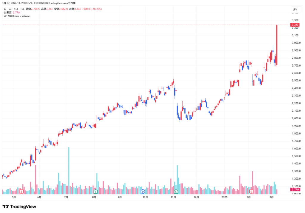ニュースが伝わった6日、株式市場では「典型的なM&A相場の反応」が起きた。素材内の分析情報によると、ローム(証券コード:6963)の株価はストップ高水準まで急騰し、デンソー(証券コード:6902)は下落した。