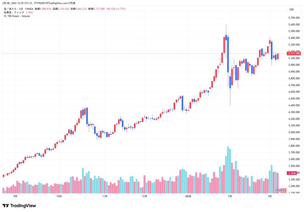 2026年3月上旬時点でも、金価格は1月29日の最高値から調整しつつも、5,100ドル前後と依然として高水準にある。「高値時代が終わった」とは言い切れない状況だ。