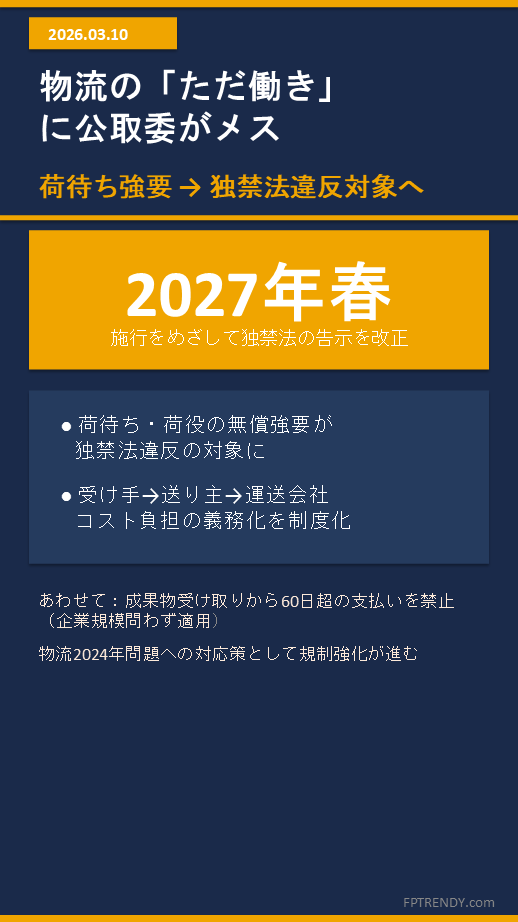 公正取引委員会(公取委)は2026年3月10日、こうした慣行を独占禁止法(独禁法)違反として扱う方針を明らかにした。独禁法の告示を改正し、2027年春の施行を目指す。