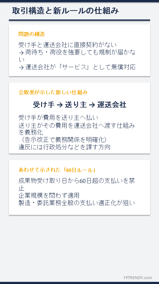 具体的には、送り主との契約にない業務を受け手が運送会社に依頼した場合、受け手が送り主にその費用を支払わなければ独禁法違反となり得る、という整理だ。受け手→送り主→運送会社という流れで費用が渡るよう、制度的な義務を明確にする。
