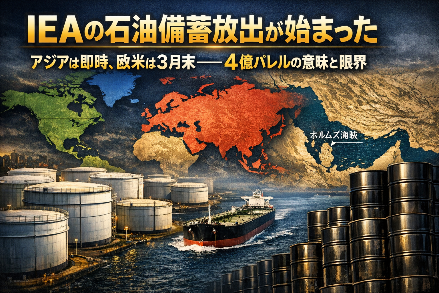 「いつ、どこに、どれだけ届くのか」——原油市場が最も知りたかった問いに、IEAがようやく答えた。3月11日に日本や欧米諸国が合意した史上最大規模の石油備蓄協調放出について、IEA(国際エネルギー機関)は3月15日、地域ごとの開始時期と放出量の内訳を明らかにした。