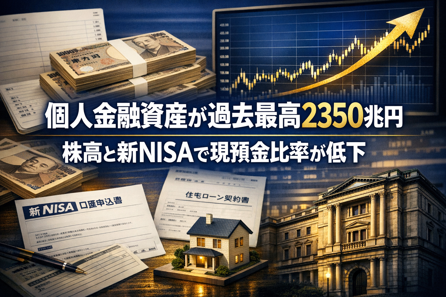日本の個人が持つ金融資産の総額が、2025年12月末時点で2350兆円を超え、過去最高を更新した。日銀の公表値では2350兆8965億円で、前の年の同じ時期と比べて5.3%増となった。この数字は一見「日本人がどんどん豊かになっている」ように映る。しかし実態は少し複雑だ。増加の中身を見ていくと、「何が変わり、何はまだ変わっていないか」が見えてくる。
