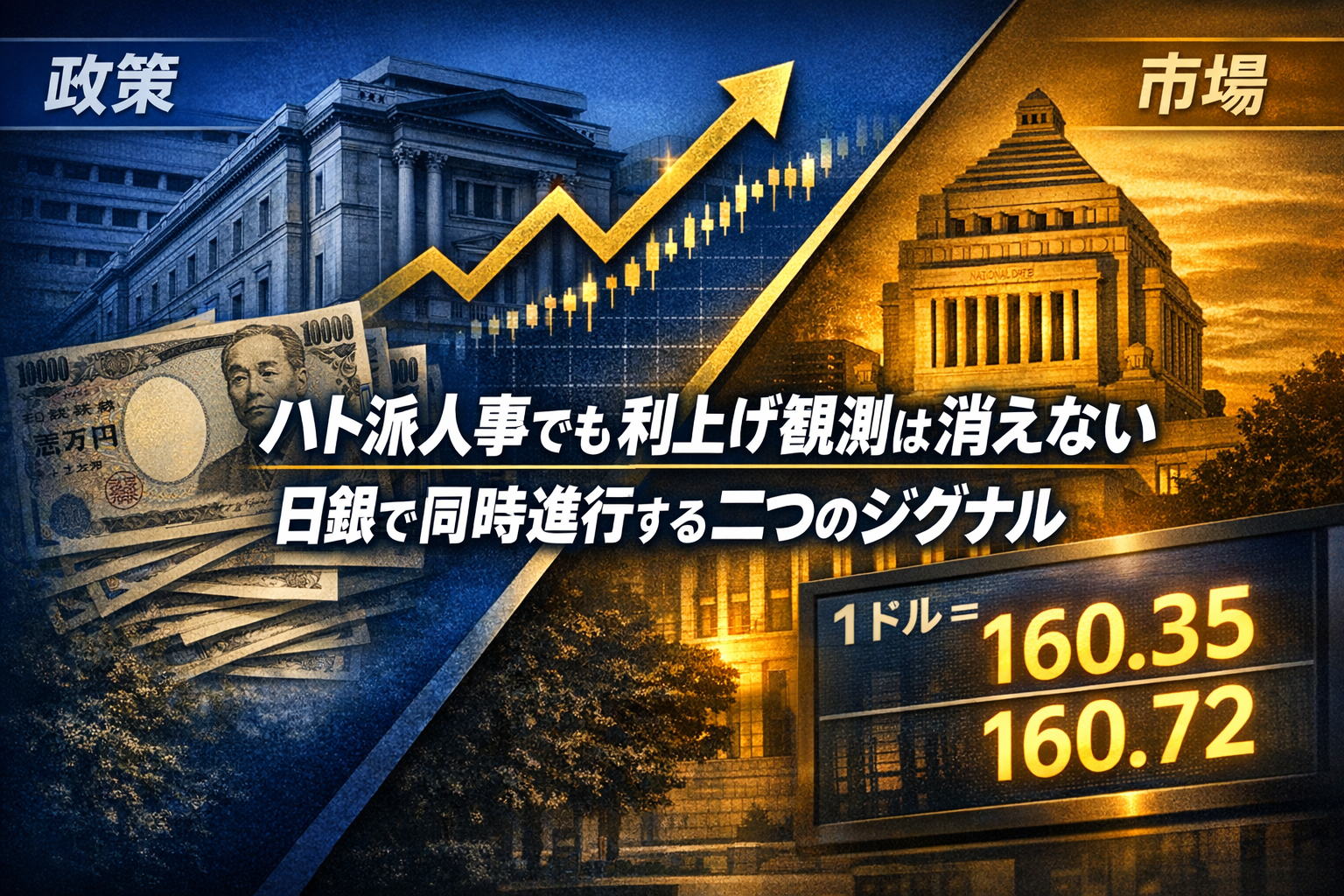 2026年3月24日、日本の参議院が日銀の政策委員会に2人の新しい審議委員を送り込む人事案を承認した。注目されるのは、2人ともが市場で「ハト派」——景気重視で金利引き上げに慎重なスタンス——と見なされる人物だという点だ。しかしその同じ週、日銀の植田和男総裁は、経済が一時的に悪化しても利上げを排除しないと示唆する発言を行っていた。政権と日銀が、市場に異なる含意を持つシグナルを送っている。
