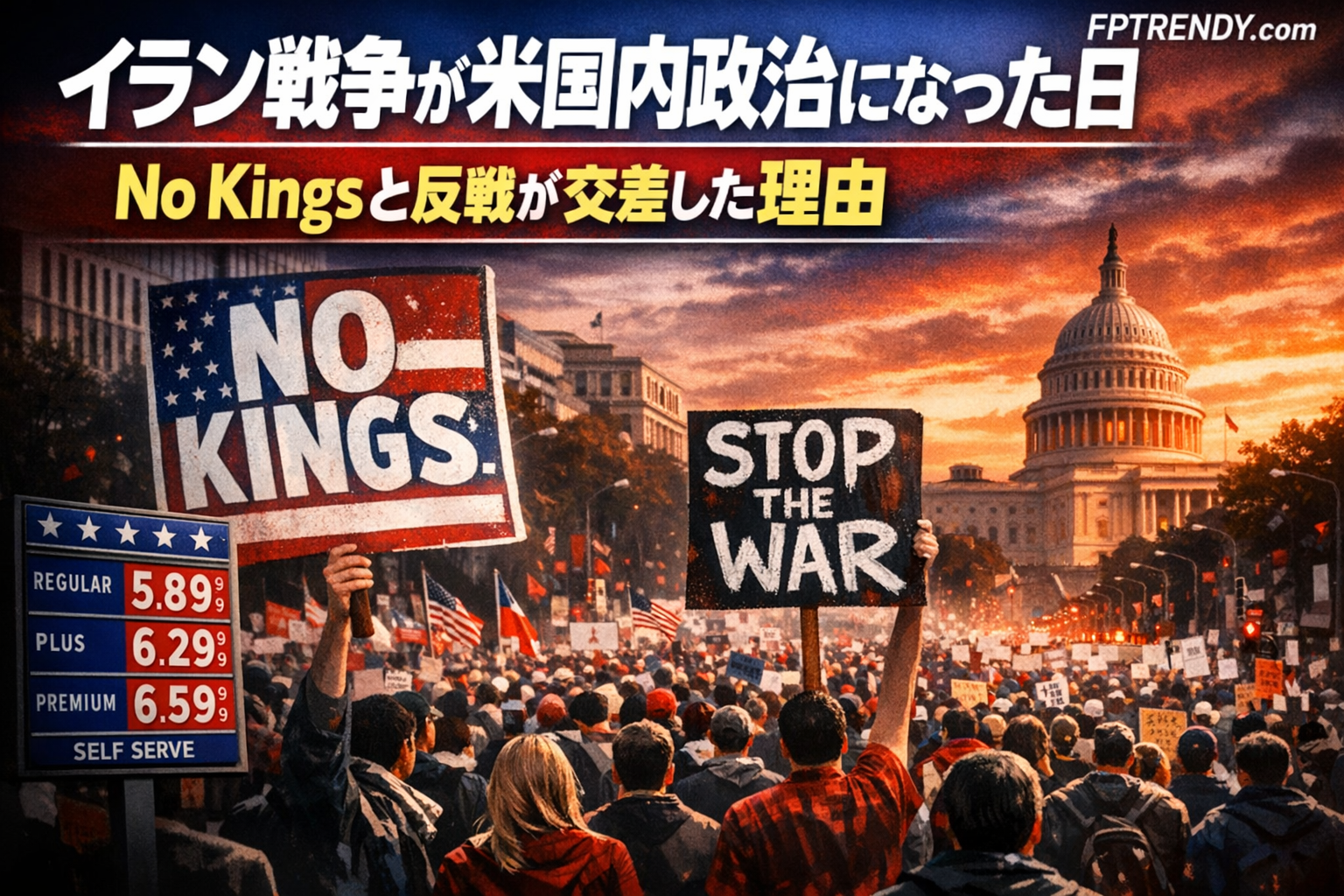 3月28日、アメリカ50州すべて、合計3000か所超で同時抗議デモが行われた。名前は「No Kings(王はいらない)」。主催者によれば過去最大規模だ。一部報道ではイラン軍事作戦への反戦色が強調されやすいが、今回起きた本質的なことは「反戦デモが起きた」ではなく、「反トランプ運動の器の中に、イラン戦争への怒りが流れ込んだ」ことだ。