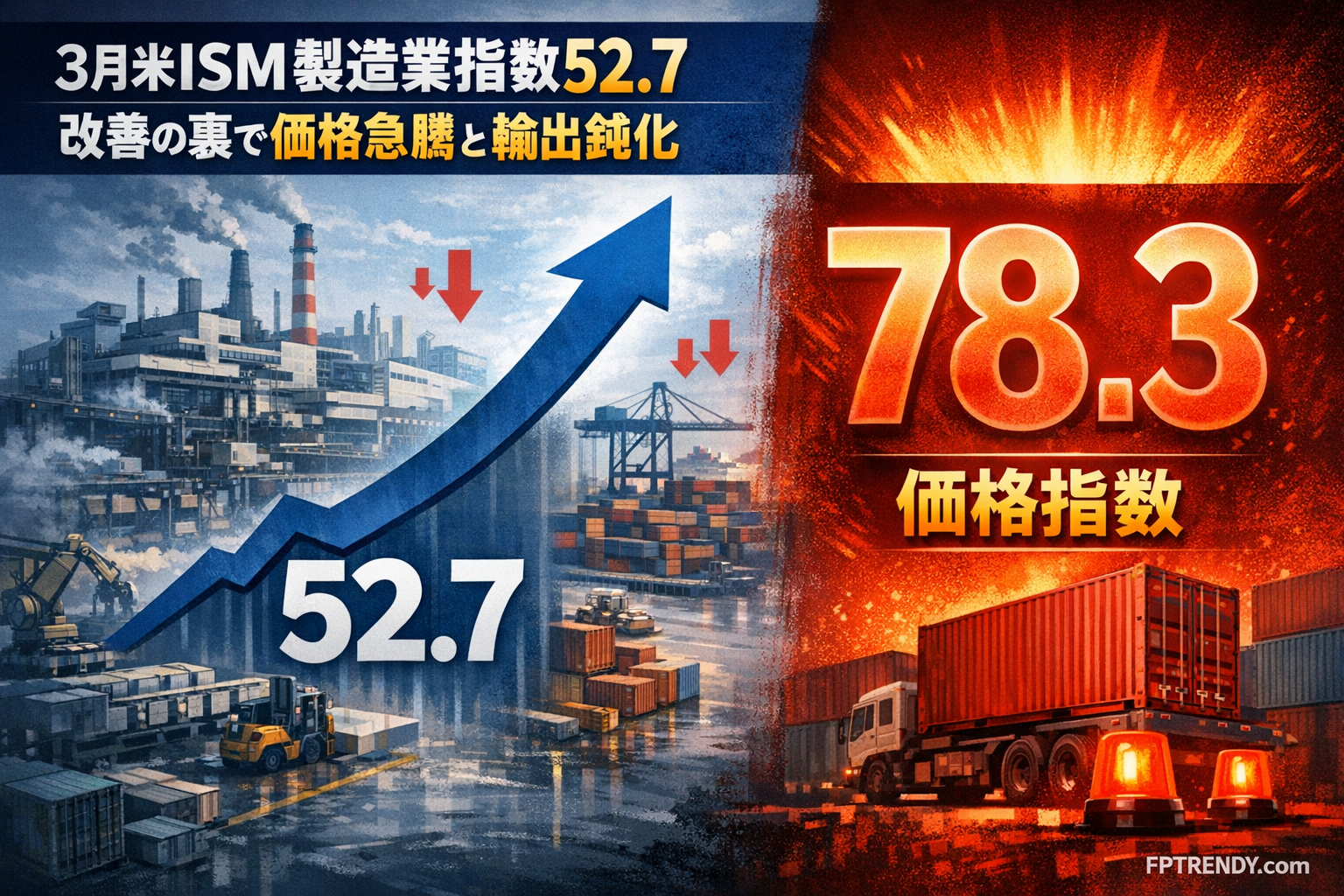 2026年3月の米ISM製造業景況感指数は52.7と改善し、米製造業が拡大圏を維持していることを示した。ただ、その内訳では価格指数が2022年6月以来の高水準に急騰し、新規輸出受注は縮小圏に戻り、雇用も弱いままだった。