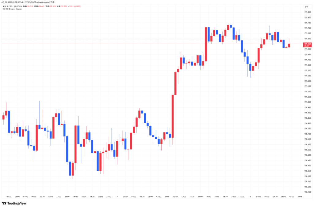 4月2日の東京外国為替市場で、円はじりじりと売られた。午後5時時点の円相場は前日比77銭の円安ドル高となり、1ドル=159円56銭〜58銭をつけた。きっかけになったのは、同日にトランプ米大統領がイランへの攻撃を今後2〜3週間続ける方針を示したことだ。中東情勢の早期収束期待が後退し、為替市場ではあらためてドル買いが強まった。