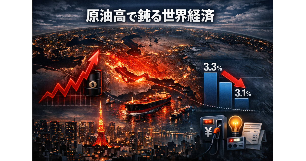 国際通貨基金(IMF)は2026年4月14日、最新の「世界経済見通し(WEO)」を公表し、2026年の世界成長率見通しを3.1%とした。2026年1月時点の3.3%からの下方修正である。今回のポイントは、単に数字が0.2ポイント下がったことだけではない。IMFは4月9日の講演で、「今回の中東情勢がなければ、世界成長率は引き上げる方向だった」と説明していた。つまり世界経済はもともと上方修正が視野に入るほどの勢いを持っていたのに、原油と天然ガスをめぐる供給ショックが、その流れを押し戻したということだ。