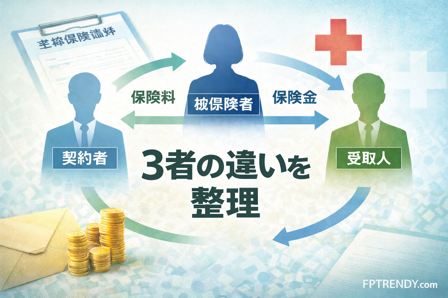 この記事では、契約者・被保険者・受取人の違いを中心に、保険料、保険金、給付金、解約返戻金、主契約、特約まで、生命保険の基本用語を順番に整理する。