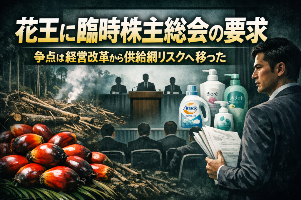 香港の投資ファンド・オアシス・マネジメントが花王に対し、パーム油・紙パルプの調達先をめぐる独立調査と臨時株主総会の開催を要求。2025年に続く株主圧力だが、今回の争点は「経営改革」から「供給網リスク」へと移った。日本企業の株主アクティビズムの新局面を読み解く。 -